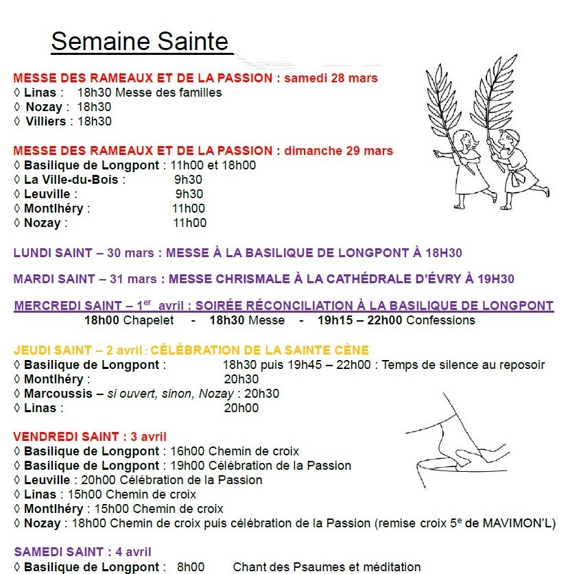 Les horaires et lieux des Messes des Rameaux et de la Passion, de la Soirée de Réconciliation, de la Célébration de la Sainte Cène etc. sont consultables ci-dessous :